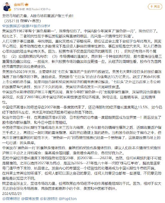 近日,财经大V@金岩石 表示,美国股市1987年有个“黑色星期一”,我亲身经历了。中国A股今年演绎了“黑色新一月”,我也经历了。相比之下,二者的共性在于事后发现都没有直接的原因,而只是一次情绪性的“踩踏”。