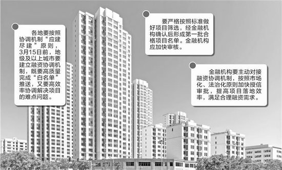 会议强调,各地要按照协调机制“应建尽建”原则,3月15日前,地级及以上城市要建立融资协调机制,既要高质量完成“白名单”推送,又要高效率协调解决项目的难点问题。要严格按照标准做好项目筛选,经金融机构确认后形成第一批合格项目名单。金融机构应加快审核。按照“推送—反馈”的工作闭环,金融机构及时反馈项目存在的问题,城市融资协调机制要第一时间统筹解决,待项目符合条件后再次向金融机构推送,共同推动融资尽快落地。各省融资协调机制要对城市推送项目进行监督指导,督促城市及时将不合格项目移出“白名单”。住房城乡建设部、金融监管总局将建立联合调度、及时通报机制,定期通报各省和城市的融资需求落实情况。